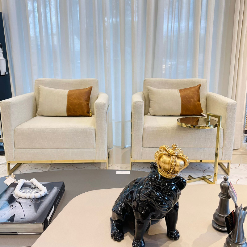 Poltrona com um design elegante, com detalhe único em inox no encosto externo, perfeita para complementar e dividir ambientes.